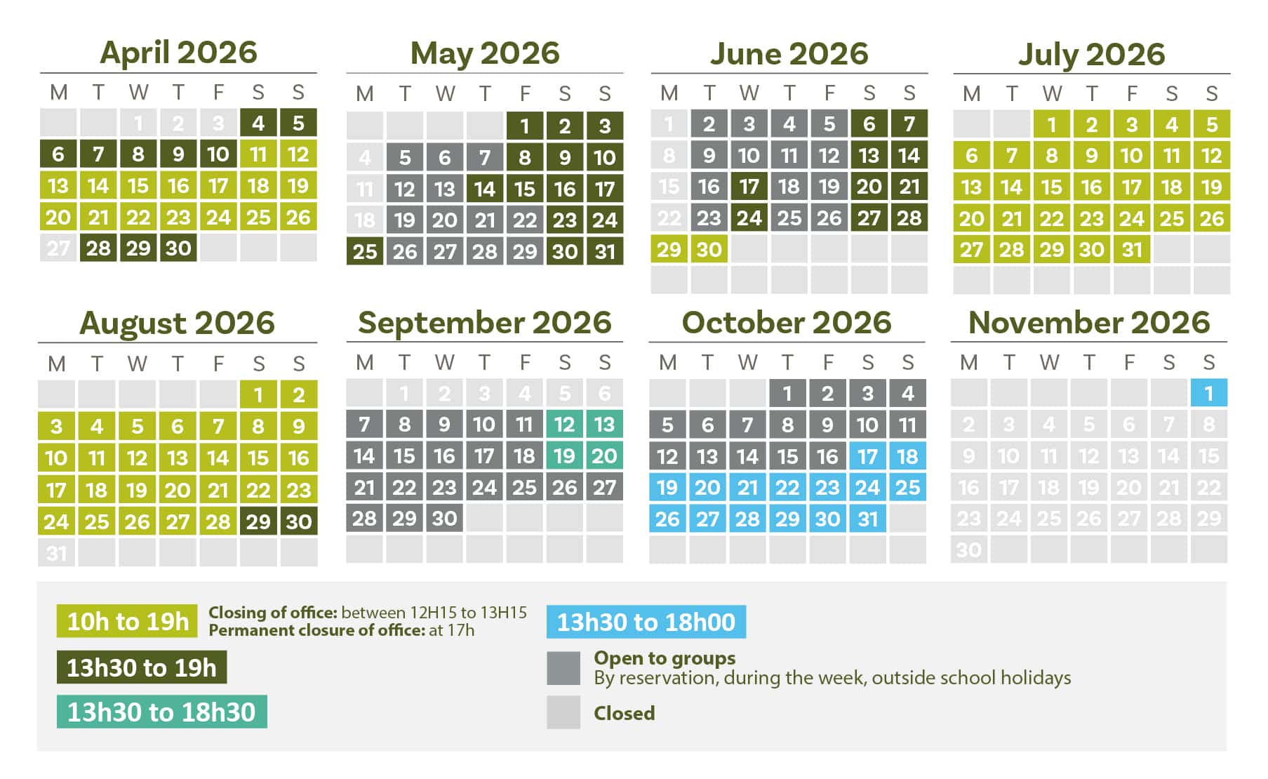 Discover our opening hours throughout the season below.